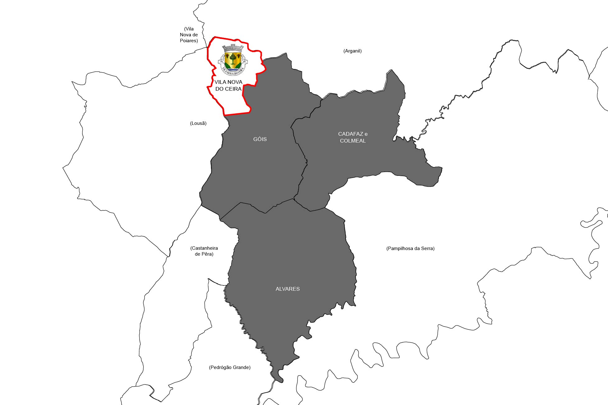 Entre S e W: Segue os limites do concelho, ou seja, do marco geodésico de Sacões segue na direcção NW até ao morro da Senhora da Candosa e prossegue até ao Rio Ceira, continuando por este.