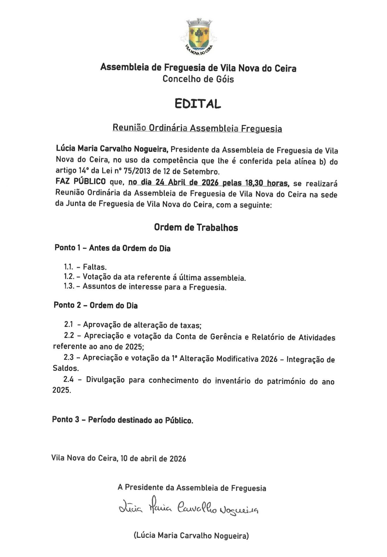 Edital - Assembleia de Freguesia - Reunião Ordinária de 24 de abril...